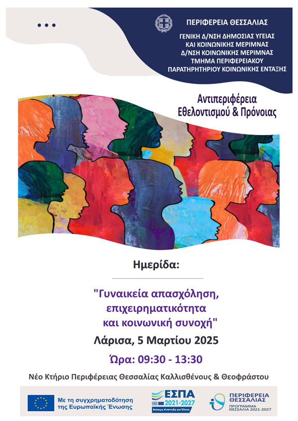 Στο πλαίσιο των εκδηλώσεων για την Παγκόσμια Ημέρα της Γυναίκας η Αντιπεριφέρεια Εθελοντισμού και Πρόνοιας σε συνεργασία με το Περιφερειακό Παρατηρητήριο Κοινωνικής Ένταξης και τη Διεύθυνση κοινωνικής Μέριμνας της Περιφέρειας Θεσσαλίας διοργανώνουν ενημερωτική ημερίδα με σκοπό την ανάδειξη των εργασιακών ζητημάτων που αντιμετωπίζουν οι γυναίκες ως μισθωτές, επιχειρηματίες και ως μέλη συνεργατικών σχημάτων και συνεταιρισμών συμπεριλαμβανομένου του τομέα της κοινωνικής και αλληλέγγυας οικονομίας.