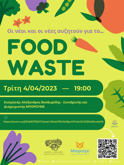 Την Τρίτη 4 Απριλίου και ώρα 19:00 θα πραγματοποιηθεί ημερίδα σχετικά με το FOOD WASTE, την οποία και διοργανώνει το Δημοτικό Συμβούλιο Νεολαίας του Δήμου Λαρισαίων σε συνεργασία με το ΜΠΟΡΟΥΜΕ.