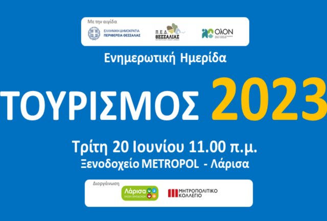 Η Ένωση Ξενοδόχων Ν. Λάρισας σε συνεργασία με το Μητροπολιτικό Κολλέγιο, με τη συμμετοχή της Περιφέρειας Θεσσαλίας, της Περιφερειακής Υπηρεσίας Τουρισμού του Υπουργείου Τουρισμού, της ΠΕΔ Θεσσαλίας, Δήμων της ΠΕ Λάρισας, του Αναπτυξιακού Οργανισμού του Δήμου Λαρισαίων ΟΛΟΝ ΑΕ του ΣΘΕΒ, των Ενώσεων Ξενοδόχων της Θεσσαλίας και άλλων θεσμικών φορέων διοργανώνει την Τρίτη 20 Ιουνίου, στις 11.00 στο ξενοδοχείο Metropol, Ημερίδα με τίτλο: ΤΟΥΡΙΣΜΟΣ 2023.