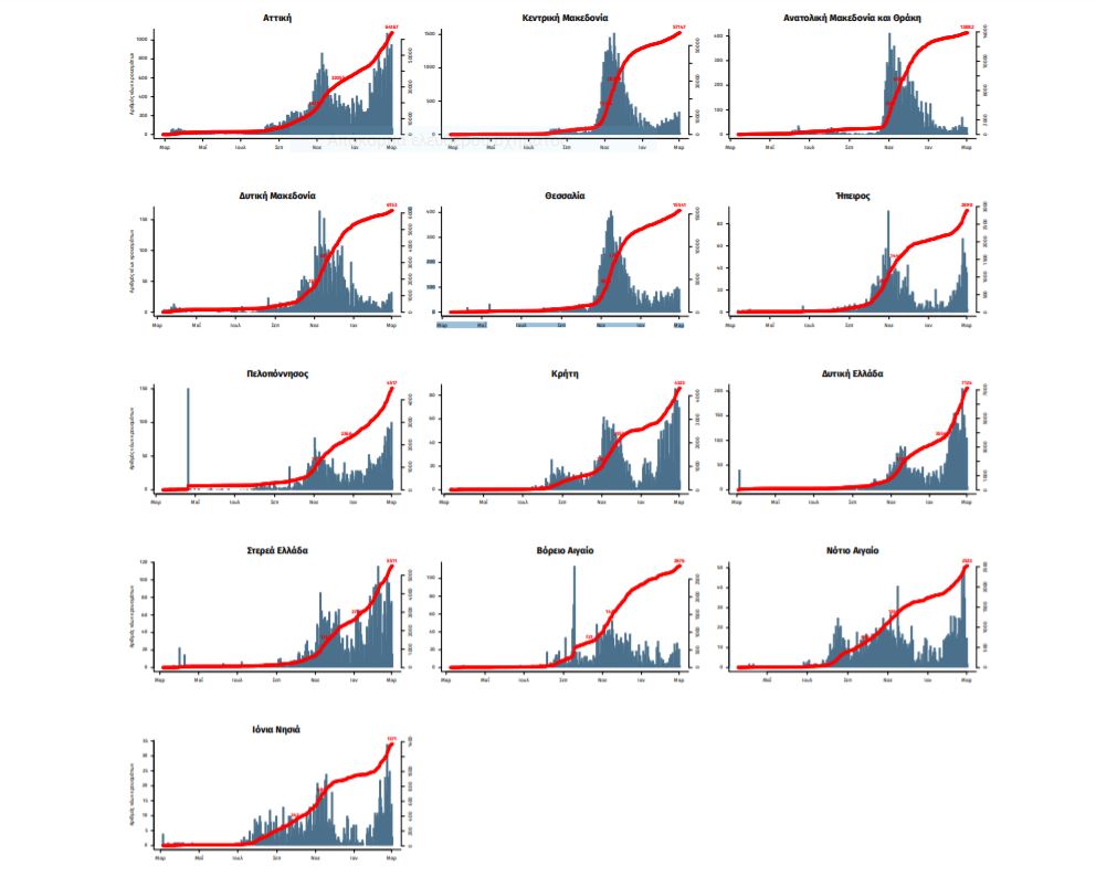 Σημ.: οι στήλες εκφράζουν τον αριθμό νέων κρουσμάτων με βάση την ημερομηνία λήψης εργαστηριακού δείγματος, και όχι με βάση την ημερομηνία ανακοίνωσης των κρουσμάτων.