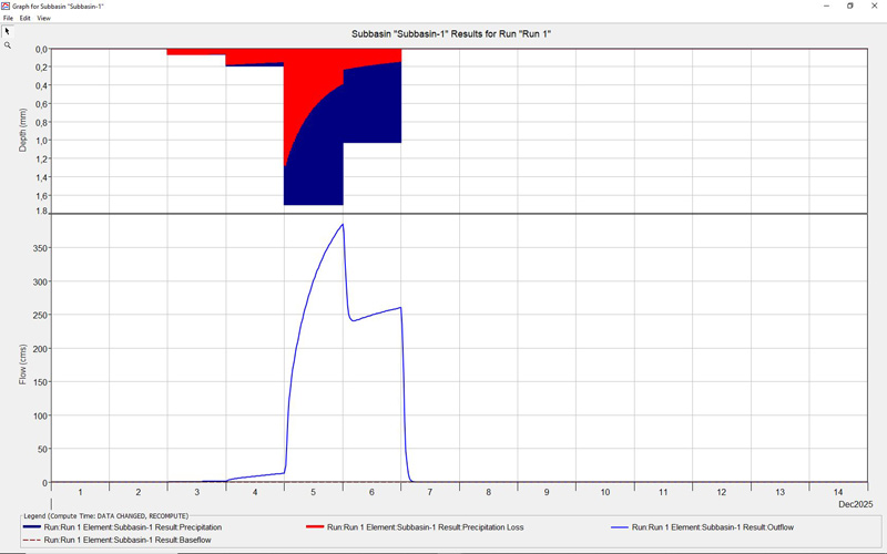 Επιπλέον, αρχικά, στην παρακάτω εικόνα απεικονίζεται το, “προσομοιωμένο ρεαλιστικό”, «διάγραμμα / ιστόγραμμα βροχόπτωσης / απορροής» του χρονικού διαστήματος, “03-06/12/2025” (“143,40 mm”), (το οποίο και «απέδωσε» την, “προσομοιωμένη ρεαλιστική”, παροχή αιχμής νερού και συγκεκριμένα «384,70 κυβικά μέτρα ανά δευτερόλεπτο» ή αλλιώς «384,70 m3/sec»), [το οποίο και «απέδωσε», λόγω του ακραίου μετεωρολογικού φαινομένου με την κωδική ονομασία «Byron», την, “προσομοιωμένη ρεαλιστική”, συνολική ποσότητα νερού, συγκεκριμένα, «47.985.600 κυβικά μέτρα (τόννους νερού)» ή αλλιώς «47.985.600 m3 (τόννους νερού)»], και το αντίστοιχο, “προσομοιωμένο ρεαλιστικό”, «υδρογράφημα απορροής πλημμύρας» που προκύπτει από το συγκεκριμένο, “προσομοιωμένο ρεαλιστικό”, επεισόδιο βροχόπτωσης, (λόγω του ακραίου μετεωρολογικού φαινομένου με την κωδική ονομασία «Byron»), (η ανάλυση και οι υπολογισμοί έγιναν με το ελεύθερο στο διαδίκτυο λογισμικό «HEC-HMS» του «U.S.A. Army Corps of Engineers» δηλαδή του «Σώματος Μηχανικών του Στρατού των Η.Π.Α.») [1,2,4,5,6.1,6.5,7].