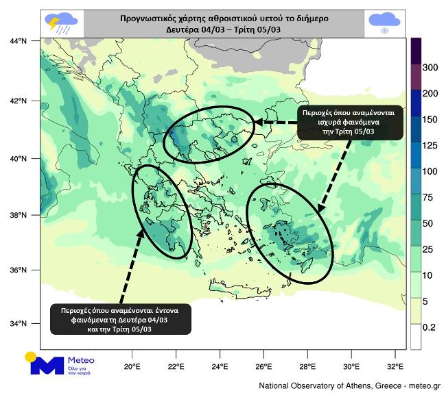 Σύμφωνα με τα προγνωστικά στοιχεία του meteo.gr / ΕΑΑ, κύρια χαρακτηριστικά του καιρού του διημέρου θα είναι οι βροχές και οι καταιγίδες – με κατά τόπους έντονα φαινόμενα – οι χιονοπτώσεις κυρίως στα ηπειρωτικά ορεινά και οι ενισχυμένοι άνεμοι (νότιοι τη Δευτέρα 04/03 και δυτικοί την Τρίτη 05/03).