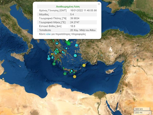 Ο πολύ δυνατός σεισμός των 5,4R σημειώθηκε 12′ λεπτά πριν τις 2 το μεσημέρι της Κυριακής (16.01.2022) στη θαλάσσια περιοχή νότια της Χαλκιδικής. Το ακριβές επίκεντρο εντοπίζεται σε απόσταση 20 χιλιομέτρων νότια – νοτιοδυτικά του Άθου.