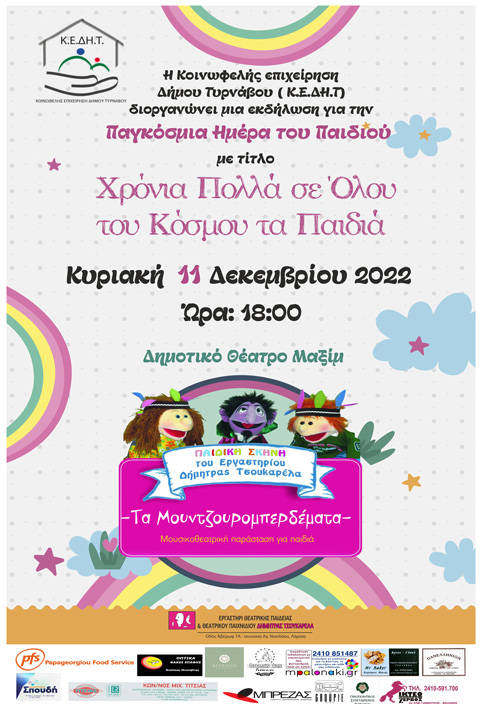 Η Κοινωφελής Επιχείρηση Δήμου Τυρνάβου (Κ.Ε.ΔΗ.Τ) διοργανώνει μια εκδήλωση για την Παγκόσμια Ημέρα του Παιδιού “Χρόνια πολλά σε όλου του κόσμου τα παιδιά”.