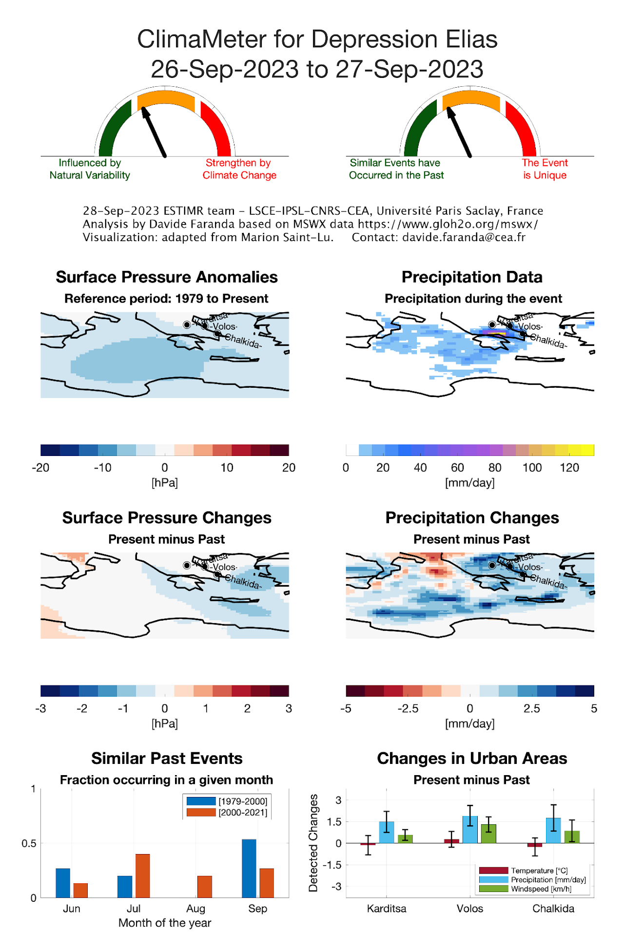 Το Climatebook συμμετείχε στη μελέτη ερευνητών από το Εργαστήριο LSCE της Γαλλίας, σχετικά με τη συνεισφορά της ανθρωπογενούς κλιματικής αλλαγής στην ένταση της κακοκαιρίας “Elias” που έπληξε με σφοδρότητα την Ελλάδα μεταξύ 25 και 28 Σεπτεμβρίου 2023. Θα πρέπει να τονιστεί ότι τα αποτελέσματα που παρουσιάζονται στο παρόν άρθρο αφορούν μόνο την συνοπτική κατάσταση της ατμόσφαιρας κατά την κακοκαιρία “Elias”, χωρίς τη σύνδεση του φαινομένου με την προηγούμενη επίσης καταστροφική κακοκαιρία “Daniel” μεταξύ 5 και 8 Σεπτεμβρίου 2023.