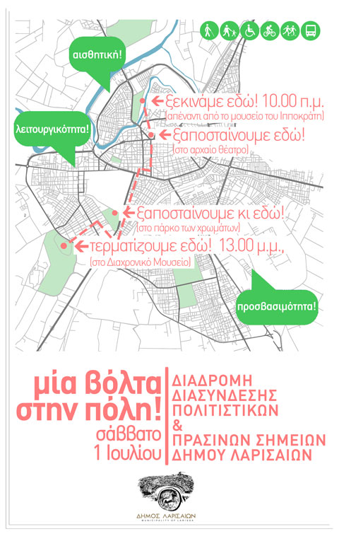 Στο πλαίσιο αυτό, προγραμματίζεται για το ερχόμενο Σάββατο 1 Ιουλίου, ανοικτή εκδήλωση, στην ουσία μια πορεία με τίτλο «ΜΙΑ ΒΟΛΤΑ ΣΤΗΝ ΠΟΛΗ» με σκοπό να αναδείξει τη Διασύνδεση Πολιτιστικών και Πράσινων Σημείων του Δήμου Λαρισαίων.