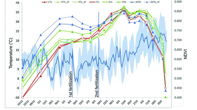 Οι νέες τεχνολογίες που εφαρμόσαμε μας έδωσαν τον χάρτη φαινομενικής ηλεκτρικής αγωγιμότητας του χωραφιού. Είναι χαρακτηριστικό ότι το χωράφι έχει ένα τμήμα με βαρύτερο έδαφος και ένα με ελαφρότερο. Στη διάρκεια της καλλιεργητικής περιόδου παρακολουθήσαμε την εξέλιξη της φυτείας με χρήση εικόνων από drones, αλλά και από δορυφόρους. Στο διάγραμμα φαίνεται η εξέλιξη τον δείκτη βλάστησης για τα διάφορα τεμάχια και από κάτω το διάγραμμα των θερμοκρασιών. Είναι χαρακτηριστικό ότι τα τεμάχια του παραγωγού (κόκκινες γραμμές) ξεκίνησαν αργότερα από τα τεμάχια του προγράμματος. Μετά τον πρώτο παγετό φαίνεται η κάμψη του δείκτη που προφανώς απεικονίζει το κιτρίνισμα των φύλλων. Με τη βελτίωση του καιρού τα φυτά αρχίζουν και πάλι να αναπτύσσονται και ο δείκτης ανεβαίνει. Μέχρι τον επόμενο παγετό που πάλι μειώνει τον δείκτη. Νομίζω ότι ο κάθε παραγωγός που παρακολούθησε στενά τη φυτεία του φέτος θα αναγνωρίζει τα φαινόμενα που είχαμε με τις παγωνιές. Είναι σημαντικό ότι ο χάρτης του δείκτη βλάστησης του Απριλίου έχει σύμπτωση με τον χάρτη παραγωγής που μας δίνει μια πρώτη χρήση του δείκτη για πρόβλεψη της παραγωγής. ‘Ένα στοιχείο χρήσιμο για την αλυσίδα παραγωγής.