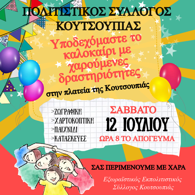 Ο Εκπολιτιστικός Εξωραϊστικός Σύλλογος Κουτσουπιάς εγκαινιάζει τις καλοκαιρινές δράσεις για το 2025 με την βιωματική εκδήλωση δημιουργικής και εικαστικής έκφρασης για παιδιά με τίτλο «ΚΑΛΩΣΗΡΘΕΣ ΚΑΛΟΚΑΙΡΙ -ΚΟΥΤΣΟΥΠΙΑ 2025». Η εκδήλωση θα πραγματοποιηθεί στην πλατεία της Κουτσουπιάς το Σάββατο 12 Ιουλίου 2025 και ώρα 8 και τέταρτο το απόγευμα.