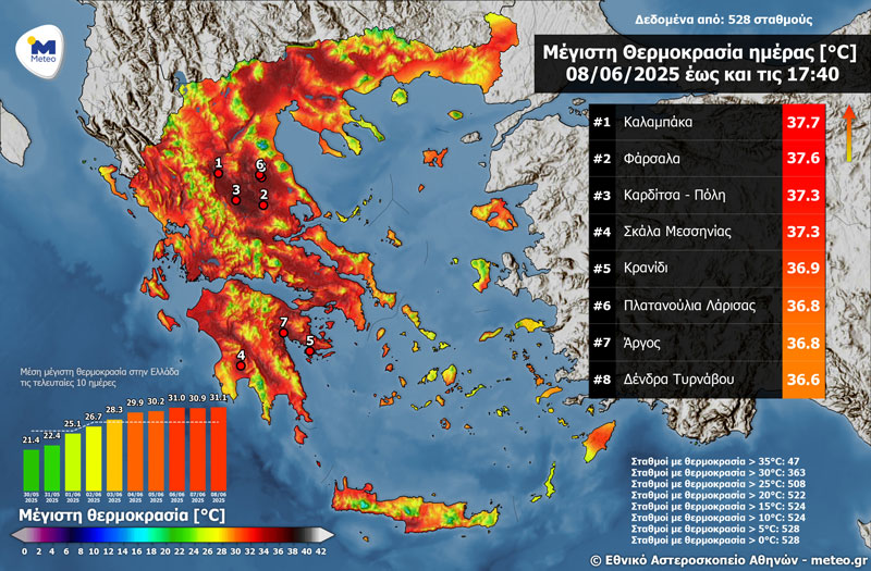 Σε υψηλά επίπεδα διατηρήθηκε η θερμοκρασία την Κυριακή 08/06, με τις μέγιστες τιμές της να ξεπερνούν τους 37 °C. Όπως ευδιάκριτα παρουσιάζεται στη χρωματική κλίμακα θερμοκρασιών του παρακάτω χάρτη, σύμφωνα με το δίκτυο αυτόματων μετεωρολογικών σταθμών του Εθνικού Αστεροσκοπείου Αθηνών / meteo.gr, 47 μετεωρολογικοί σταθμοί κατέγραψαν μέγιστες θερμοκρασίες άνω των 35 °C.
