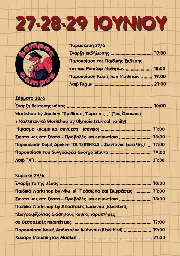 Μπορείτε επίσης να βρείτε το αναλυτικό πρόγραμμα του φεστιβάλ, καθώς και περισσότερες ανακοινώσεις και ενημερώσεις, στα επίσημα social media του Kampos Campus: