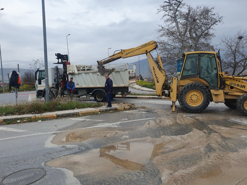 Η μεγάλη επιχείρηση της ΔΕΥΑΤ συνεχίζεται για την αποκατάσταση της ζημιάς στο δρόμο που συνδέει τον Τύρναβο με τον Αμπελώνα.