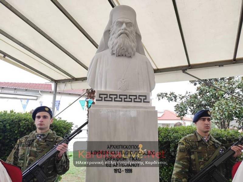 Εκτός του ναού και παρουσία της μπάντας του Δήμου Καρδίτσας και στρατιωτικού αγήματος από το ΚΕΣΝ Ρούσσου, που απέδιδε τιμές, ο Μακαριότατος Αρχιεπίσκοπος έκανε τα αποκαλυπτήρια της προτομής, εν μέσω χειροκροτημάτων.