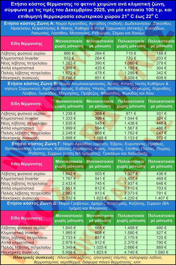 Από τον πίνακα μπορείτε να υπολογίσετε το δικό σας ετήσιο κόστος θέρμανσης για τη χειμερινή σεζόν 2025-2026, ανάλογα με το είδος θέρμανσης που χρησιμοποιείτε, την κλιματική ζώνη που ανήκετε, το εμβαδό της κατοικίας σας, το είδος της κατοικίας σας (μονοκατοικία ή πολυκατοικία με ή χωρίς μόνωση), με απλή αναγωγή, αφού στον πίνακα δίνεται το κόστος για κατοικία 100 τ.μ.