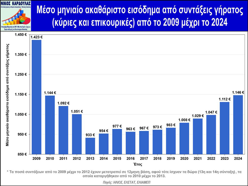 Το μέσο μηνιαίο ακαθάριστο εισόδημα από συντάξεις γήρατος (κύριες και επικουρικές) από το 2009 τα 1423 ευρώ ενώ το 2024 το μέσο ακαθάριστο είναι τα 1146.