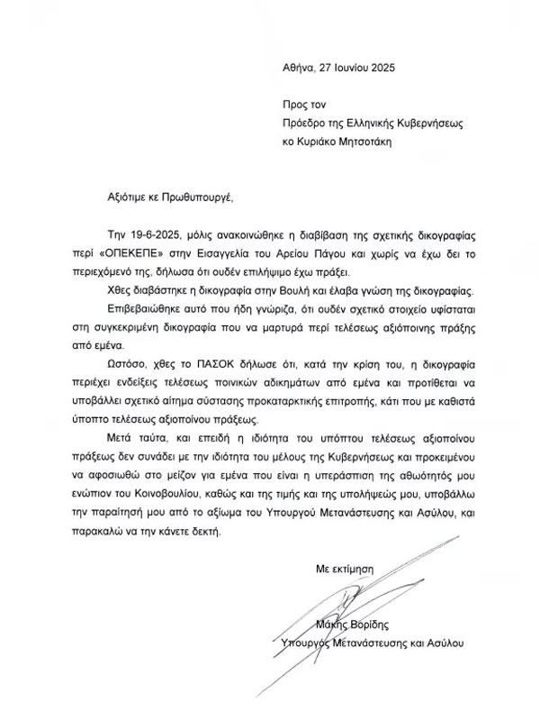 Όπως ανακοίνωσε ο κυβερνητικός εκπρόσωπος Παύλος Μαρινάκης, «ανακοινώνεται ότι ο Υπουργός Μετανάστευσης και Ασύλου Μάκης Βορίδης υπέβαλε την παραίτησή του στον Πρωθυπουργό, για τους λόγους που αναφέρονται στην επιστολή και η οποία επισυνάπτεται. Ο Πρωθυπουργός έκανε δεκτή την παραίτησή του