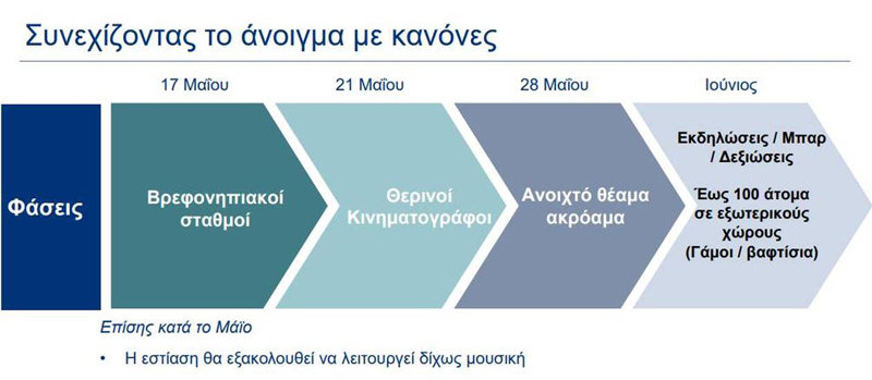 Αναφερόμενος ο κ. Σκέρτσος ειδικά στα καταστήματα εστίασης που έχουν ανεβάσει ρολά ήδη, από τις 3 Μαϊου, μετά από έξι μήνες λουκέτου λόγω πανδημίας, είπε ότι αυτά θα συνεχίσουν να λειτουργούν αλλά χωρίς ζωντανή μουσική καθ΄όλη τη διάρκεια του Μαΐου.