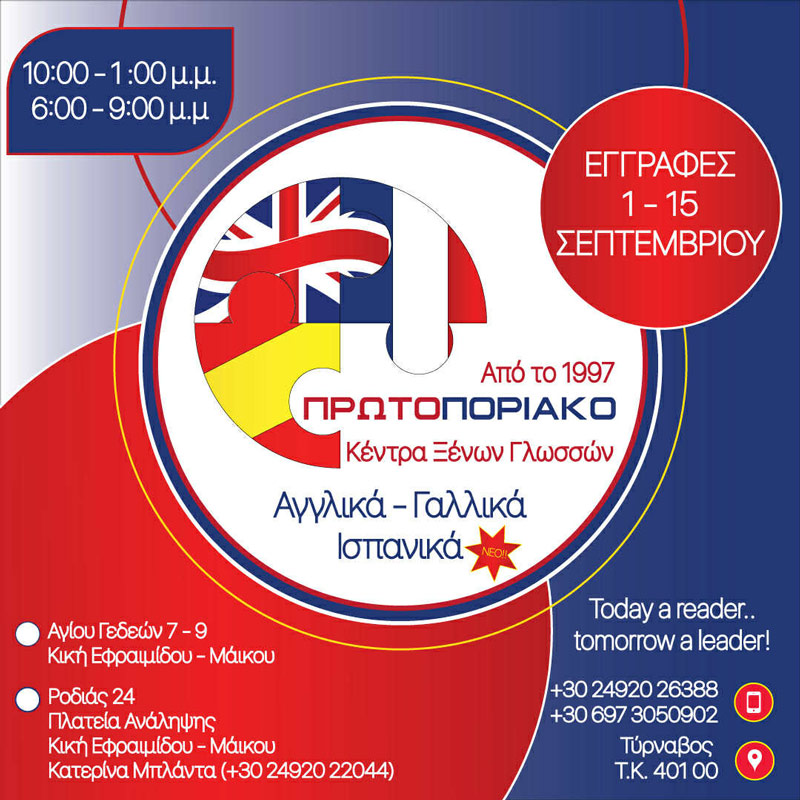 Τα Κέντρα Ξένων Γλωσσών «Πρωτοποριακό» στον Τύρναβο και στο Δαμάσι, με 28 χρόνια εμπειρίας και σύγχρονες μεθόδους διδασκαλίας, ξεκινούν τις εγγραφές για το σχολικό έτος 2025-2026. Οι εγγραφές θα πραγματοποιούνται από 1 έως 12 Σεπτεμβρίου (πρωί 9:00-13:00, απόγευμα 18:00-21:00), ενώ τα μαθήματα θα ξεκινήσουν στις 15 Σεπτεμβρίου. Τμήματα Αγγλικών, Γαλλικών και Ισπανικών για όλες τις ηλικίες, σε ένα περιβάλλον μάθησης που συνδυάζει ποιότητα, μεράκι και στόχο την επιτυχία!