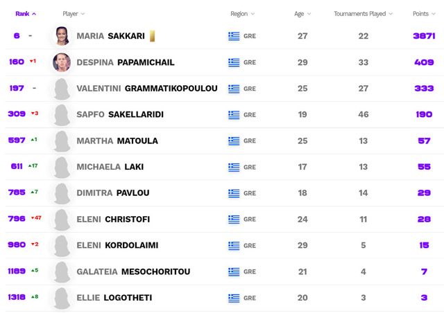 Πάντα πρώτη Ελληνίδα είναι η Μαρία Σάκκαρη, η οποία βρίσκεται στο Νο.6 της παγκόσμιας κατάταξης, απ’ όπου θα αποχαιρετήσει και τη σεζόν.