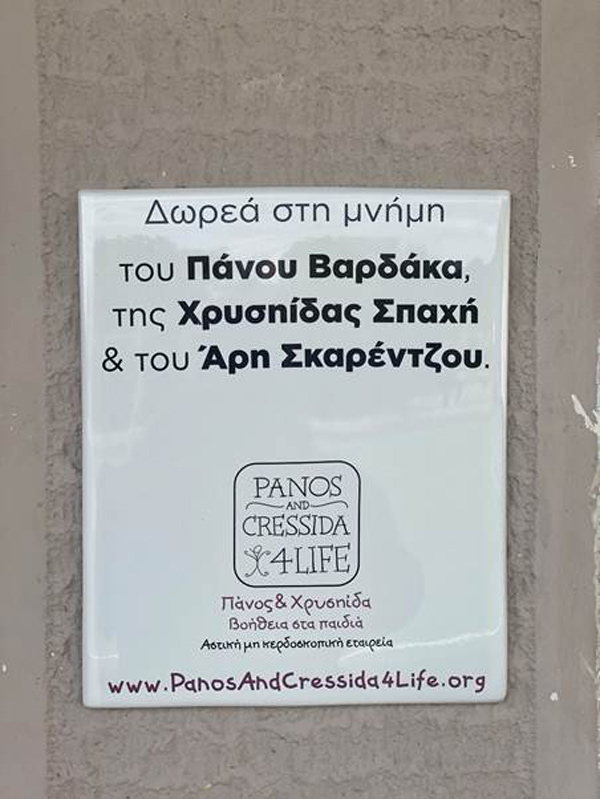 Η οργάνωση Πάνος και Χρυσηίδα, που ιδρύθηκε στη μνήμη των δύο παιδιών παλεύει με μόνη στήριξη αυτή των φίλων της και του κόσμου που τη γνωρίζει και την εμπιστεύεται να κάνει λίγο καλύτερη τη ζωή νέων και παιδιών που βρίσκονται σε ανάγκη. Οι γονείς του Άρη θέλοντας να τιμήσουν τη μνήμη του συνεργάζονται από το 2023 με την οργάνωση προσπαθώντας να συνδράμουν τους σκοπούς της.