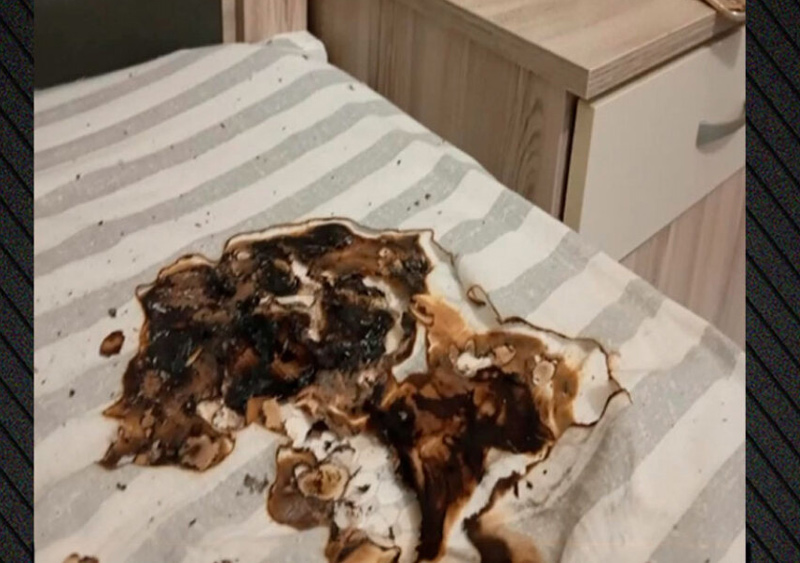 Στις φωτογραφίες που μεταδόθηκαν φαίνεται το καμμένο στρώμα αλλά και το έγκαυμα που υπέστη ο νεαρός, ο οποίος πήγε στο νοσοκομείο για να περιποιηθούν οι γιατροί τα τραύματά του.