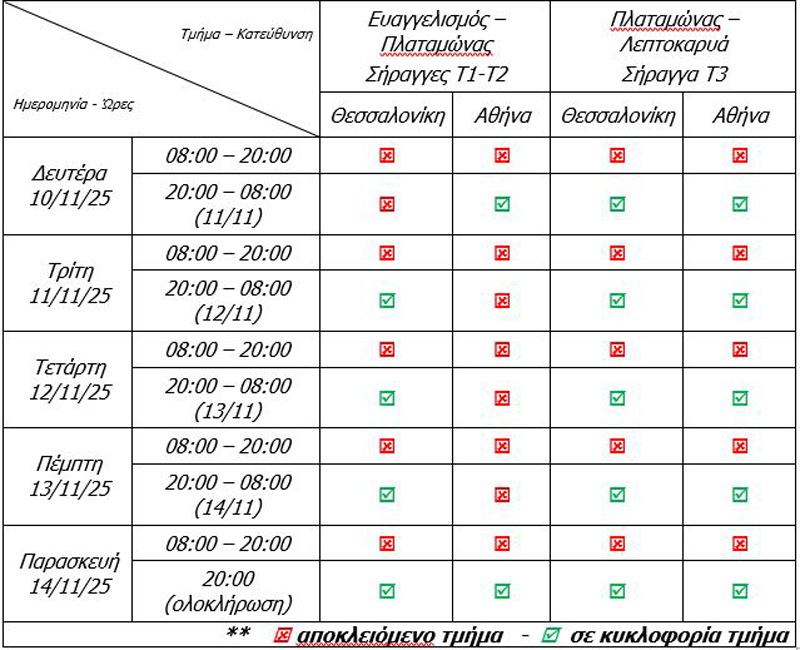 - Δευτέρα 10 Νοεμβρίου 2025 απόγευμα: απόδοση σε κυκλοφορία τμήματος Πλαταμώνας – Λεπτοκαρυά προς Θεσσαλονίκη και Λεπτοκαρυά – Ευαγγελισμός προς Αθήνα (θα παραμείνει αποκλεισμένο το τμήμα Ευαγγελισμός – Πλαταμώνας προς Θεσσαλονίκη).