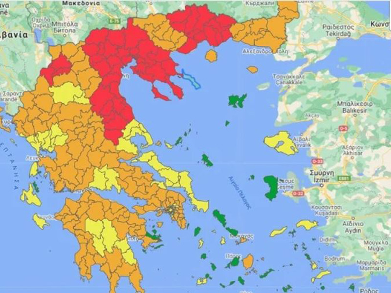 Στον επικαιροποιημένο χάρτη, στο «κόκκινο» βρίσκονται από σήμερα, Θεσσαλονίκη, Λάρισα, Χαλκιδική και Κιλκίς.