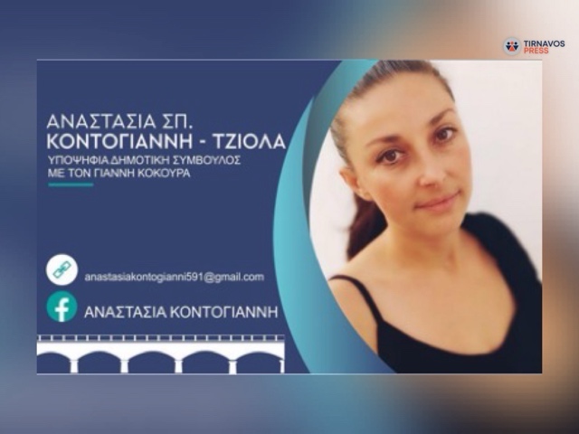 Υποψήφια με τον Γιάννη Κόκουρα και τον συνδυασμό Νέα Δημοτική κίνηση Τυρνάβου κατεβαίνει στις εκλογές του Οκτωβρίου η Κοντογιάννη Τζιόλα Αναστασία.