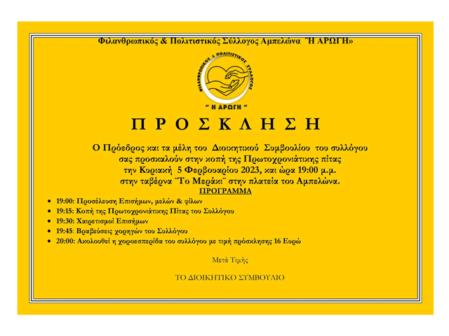 • 19:15: Κοπή της Πρωτοχρονιάτικης Πίτας του Συλλόγου