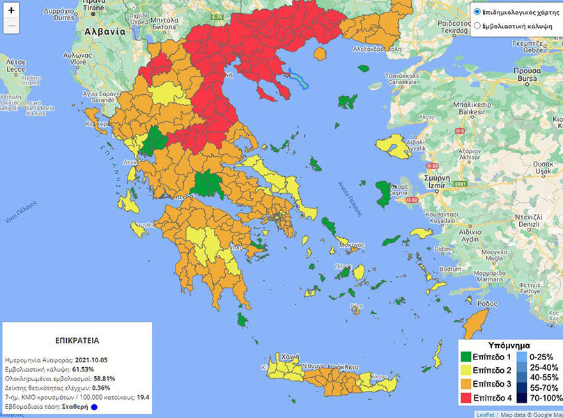 Ακόμη περισσότερες περιοχές της βόρειας Ελλάδας βρίσκονται στο «κόκκινο» (επίπεδο 4), βάσει του νέου επιδημιολογικού χάρτη που δόθηκε στη δημοσιότητα.