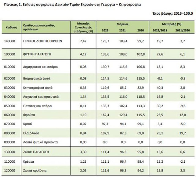Η αύξηση του Γενικού Δείκτη Τιμών Εκροών κατά 19,7%, τον μήνα Μάρτιο 2022, σε σύγκριση με τον αντίστοιχο δείκτη του Μαρτίου 2021, οφείλεται στην αύξηση κατά 22,6% του δείκτη τιμών της φυτικής παραγωγής και κυρίως στη μεταβολή της ομάδας φρούτα κατά 25,5%. Σημαντική αύξηση παρουσίασαν τα κτηνοτροφικά φυτά κατά 40,3% και οι πατάτες και σπόροι κατά 30,2%, ενώ και το ελαιόλαδο καταγράφει αύξηση κατά 25,1%
