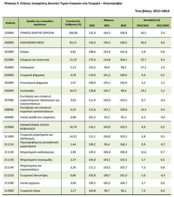 Ο Γενικός Δείκτης Τιμών Εισροών στη Γεωργία – Κτηνοτροφία του μηνός Μαρτίου 2022, στον οποίο αποτυπώνεται το κόστος παραγωγής αυξήθηκε τον Μάρτιο κατά 26,5% έναντι μηνιαίας αύξησης 6,6%.