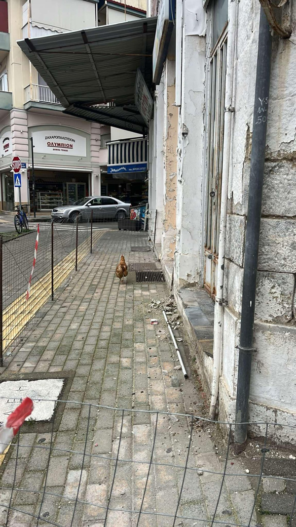 Είναι άγνωστο πώς βρέθηκε εκεί, αλλά το σίγουρο είναι πως μας χάρισε μια αστεία σκηνή. Μπορεί να είμαστε συνηθισμένοι σε κοτέτσια, αλλά το να βλέπεις μια κότα να περπατάει στο κέντρο του Τυρνάβου; Αυτό δεν το λες και καθημερινό!