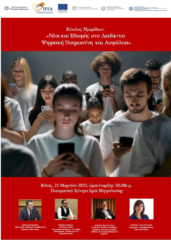 Το Europe Direct Περιφέρειας Θεσσαλίας και η Περιφέρεια Θεσσαλίας, σε συνεργασία με το Υπουργείο Ψηφιακής Διακυβέρνησης, το Υπουργείο Παιδείας, Θρησκευμάτων και Αθλητισμού και την Περιφερειακή Διεύθυνση Πρωτοβάθμιας & Δευτεροβάθμιας Εκπαίδευσης Θεσσαλίας, διοργανώνουν Κύκλο Ημερίδων με θέμα «Νέοι και Εθισμός στο Διαδίκτυο, Ψηφιακή Νοημοσύνη και Ασφάλεια».