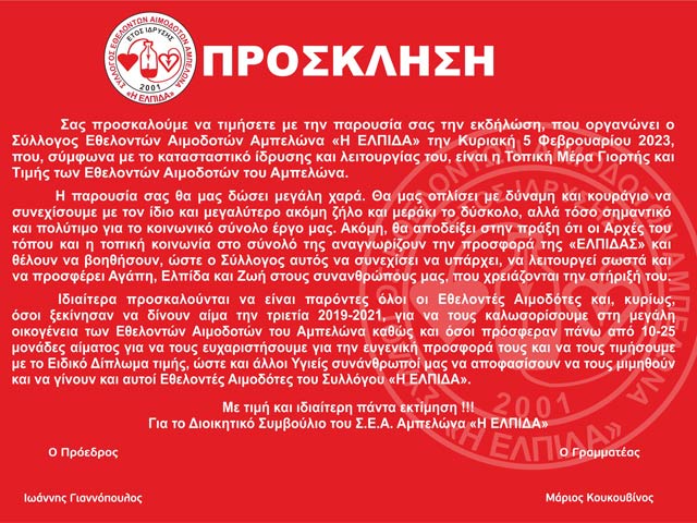 Στην εκδήλωση καλούνται να πάρουν μέρος όλοι οι αιμοδότες, μέλη του Συλλόγου και οι Φίλοι της αιμοδοσίας του Αμπελώνα και των Τοπικών Κοινοτήτων, Δελερίων και Ροδιάς, καθώς και οι εκπρόσωποι Φορέων και Συλλόγων του Δήμου Τυρνάβου, που αναγνωρίζουν και τιμούν το έργο και την προσφορά του Συλλόγου αυτού στο κοινωνικό σύνολο.