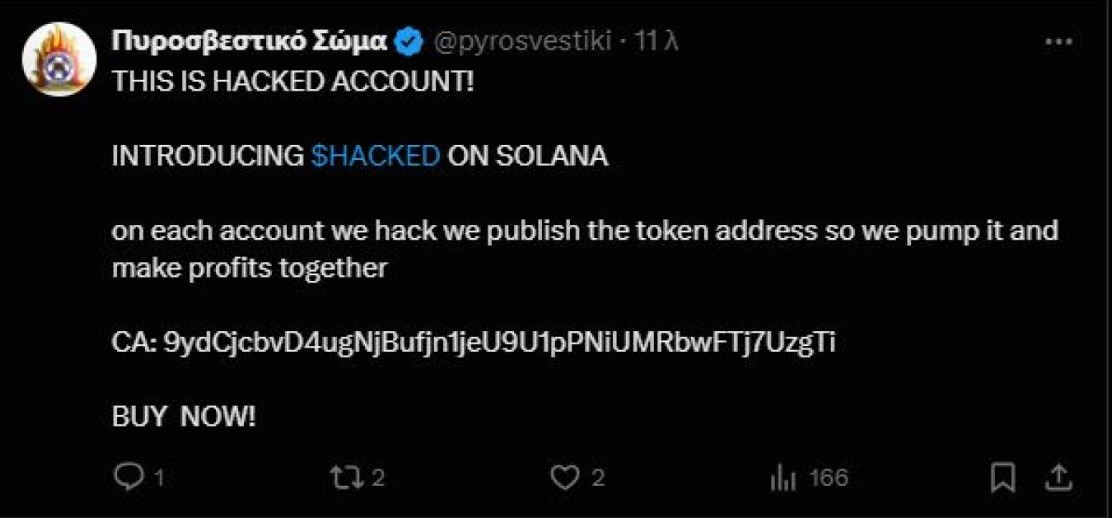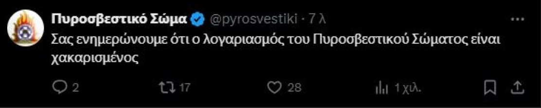 Ειδικότερα, λίγα λεπτά μετά τις 21:00 το βράδυ της Τετάρτης (18/09), στον λογαριασμό της Πυροσβεστικής στο «X» εμφανίστηκε μία ανάρτηση που έγραφε ότι ο λογαριασμός έχει χακαριστεί. Λίγο αργότερα, η εν λόγω ανάρτηση εξαφανίστηκε από τον λογαριασμό, με την Πυροσβεστική να κάνει ανάρτηση στην οποία γνωστοποιεί κι επίσημα ότι ο λογαριασμός της στο X είναι χακαρισμένος.