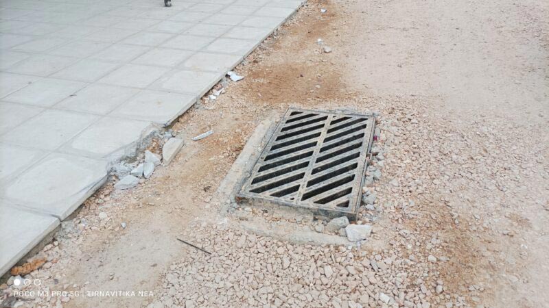 Τα έργα που βρίσκονται ακόμη σε εξέλιξη δεν έχουν φτάσει στο σημείο της επισκευής του δρόμου που υπάρχει ανάμεσα στα στέγαστρα, με αποτέλεσμα να μην υπάρχει η βάση για να είναι ασφαλή τα πλακάκια και στην καταπόνηση που δέχονται σπάνε.