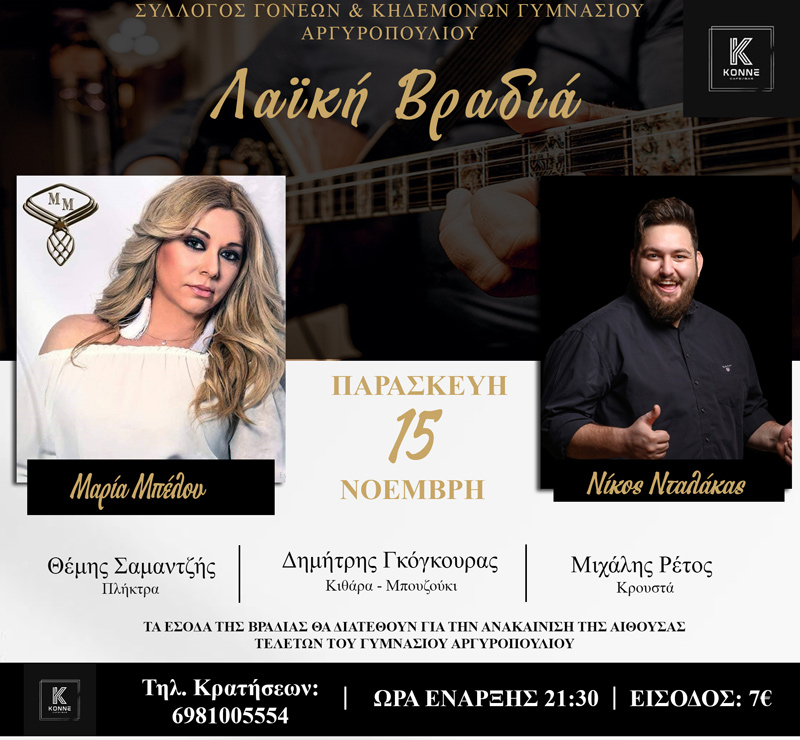 Ο Σύλλογος Γονέων και Κηδεμόνων του Γυμνασίου Αργυροπουλίου διοργανώνει μια λαϊκή βραδιά στο καφέ – μπαρ ΚΟΝΕ με τους :