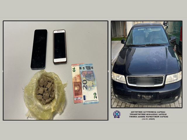 Συνελήφθησαν δύο άτομα στη Λάρισα για παράβαση της νομοθεσίας περί ναρκωτικών. Κατασχέθηκαν, μεταξύ άλλων, -82,5- γραμμάρια ηρωίνης σε βραχάκια και Ι.Χ.Ε. αυτοκίνητο
