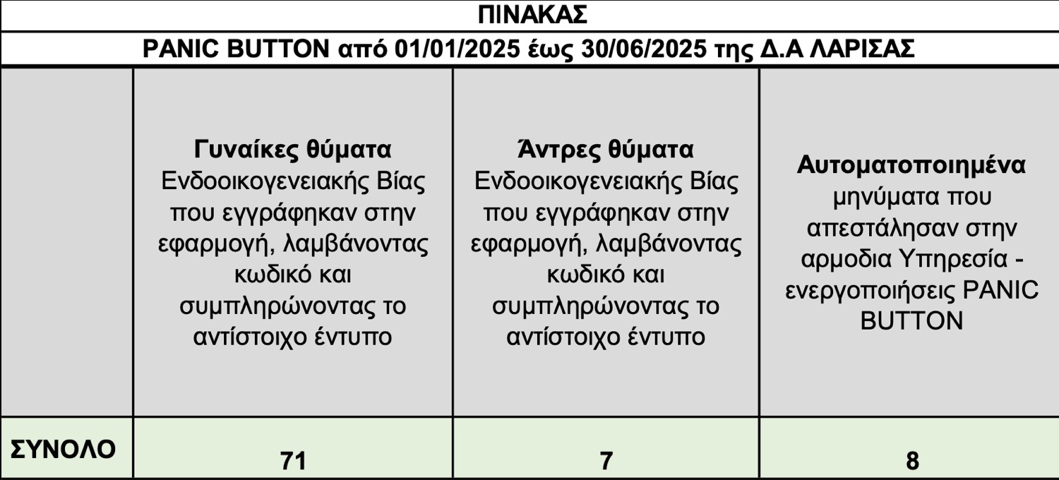 Ένα σημαντικό εργαλείο στα χέρια των θυμάτων είναι το Panic button. 71 γυναίκες και αντιστοίχως 7 άνδρες, θύματα ενδοοικογενειακής βίας εγγράφηκαν στην σχετική εφαρμογή, λαμβάνοντας κωδικό και συμπληρώνοντας το αντίστοιχο έντυπο.