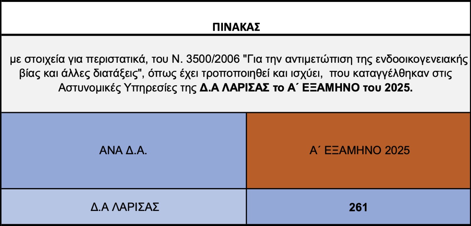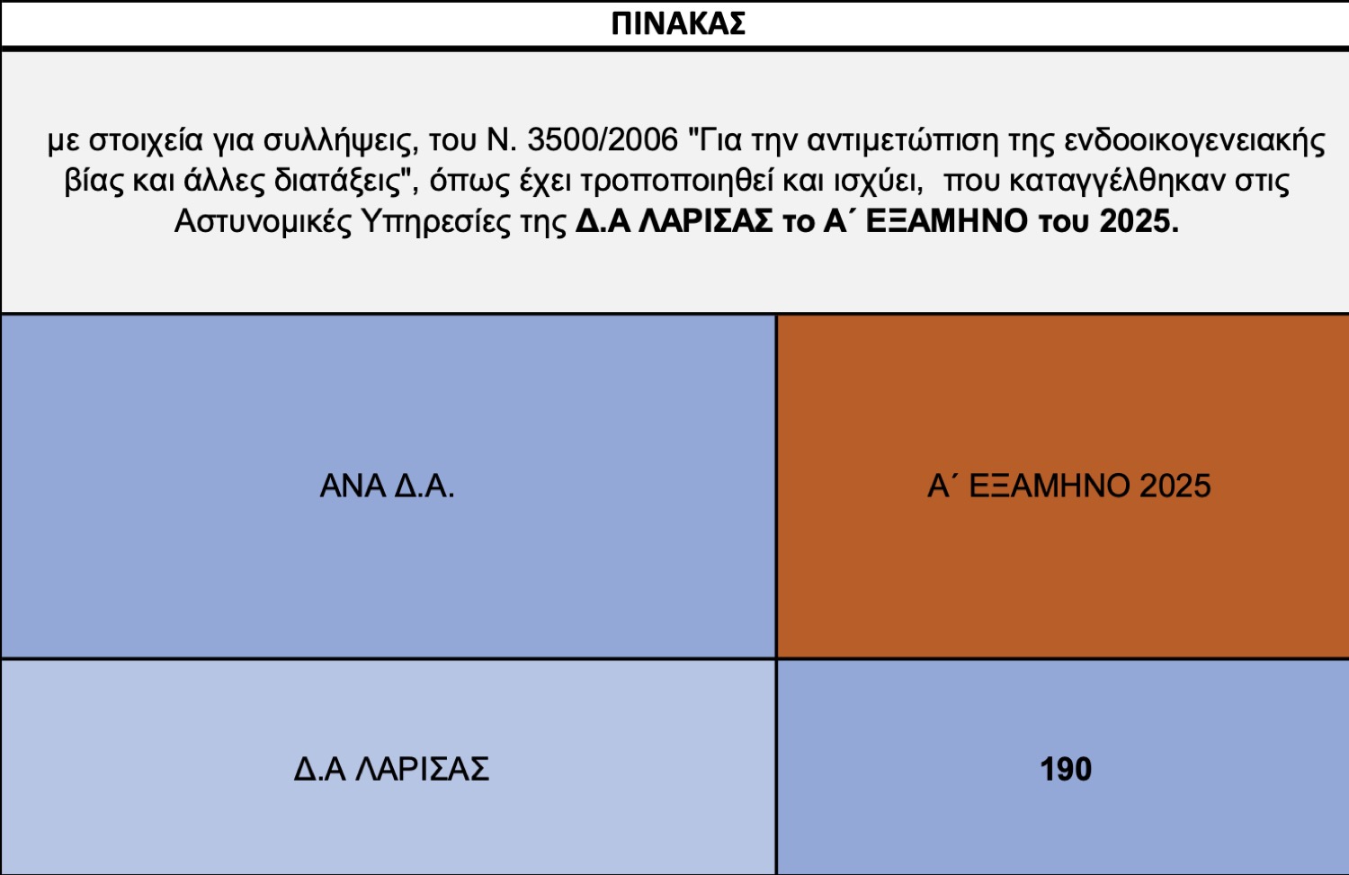 Το πρώτο εξάμηνο του 2025 τα περιστατικά ενδοοικογενειακής βίας που καταγγέλθηκαν στην Διεύθυνση Αστυνομίας Λάρισας είναι 261. Από αυτά χρειάστηκε οι αστυνομικοί να προχωρήσουν σε 190 συλλήψεις.