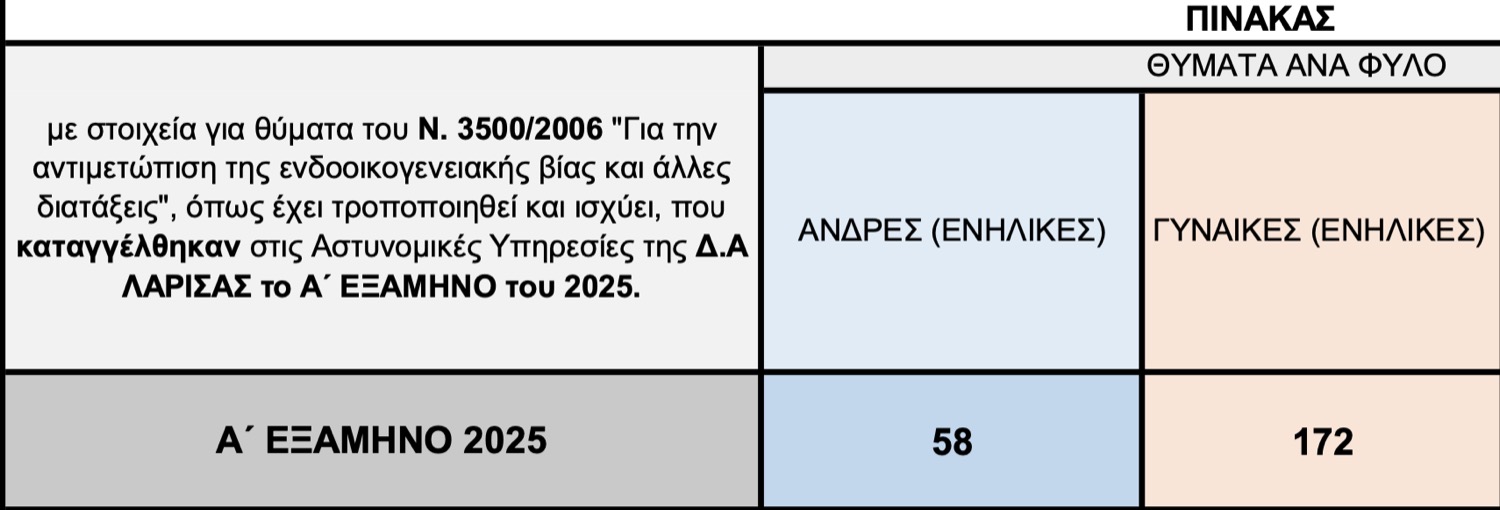 172 γυναίκες έπεσαν θύματα κακοποιητικής συμπεριφοράς στην περιοχή της Λάρισας αυτούς τους πρώτους έξι μήνες του 2025, ενώ αντιστοίχως στην ίδια δυσμενή θέση βρέθηκαν και 58 άνδρες.