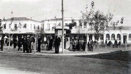 Μια παλιά φωτογραφία από το περίπτερο που ήταν μπροστά από εκεί που σήμερα είναι τα ΚΕΠ και στη σειρά τα καφενεία της εποχής που πλέον είναι η Τράπεζα Πειραιώς.