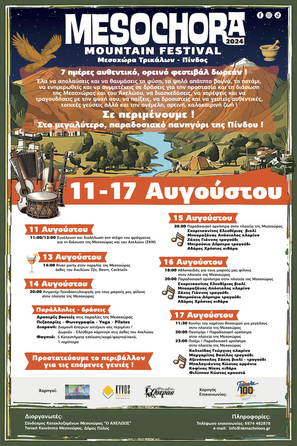 Στο βάθος, τα βουνά της Κατούνας και οι κορυφές Γκρόπα και Καράβα κατάφυτα με έλατα και βαλανιδιές στολίζουν το τοπίο της περιοχής με ιδιαίτερη ομορφιά.