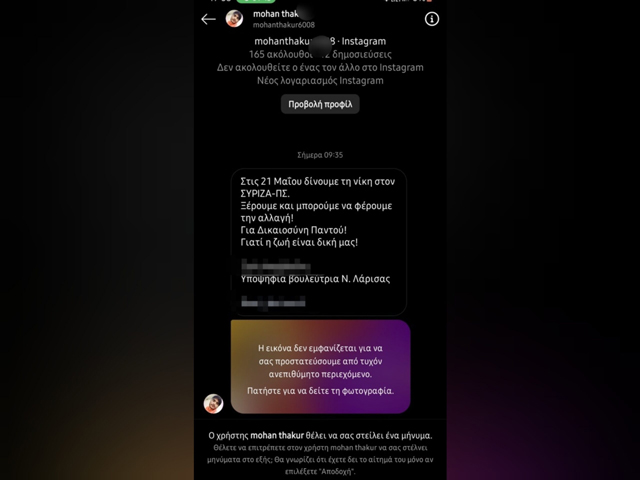 Όπως εντοπίσαμε σήμερα μπαίνοντας στο Instagram, γνωστή υποψήφια στο Ν. Λάρισας (ονόματα δεν λέμε οικογένειες δεν θίγουμε), στέλνει μηνύματα τα οποία (για όσους έχουν κλειστό προφίλ εμφανίζονται στα αιτήματα) καλούν τον κόσμο να την ψηφίσει αλλά… με αποστολέα συνήθως κάποιον από το Πακιστάν.
