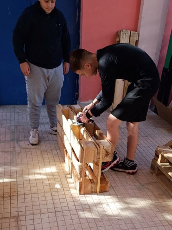 Ιδιαίτερη μνεία αξίζουν οι «καλλιτέχνες» μαθητές μας, οι οποίοι ανέλαβαν την πιο απαιτητική και δημιουργική πλευρά του εγχειρήματος: Σελεμετζίδης Κωνσταντίνος, Τζινάλας Θοδωρής και Σινάνι Ίντριτ, της Γ τάξης. Με τις ιδέες, την τεχνική και την υπομονή τους, κατάφεραν να μεταμορφώσουν απλά υλικά σε λειτουργικά και αισθητικά όμορφα έπιπλα, που θα φιλοξενούν καθημερινά στιγμές χαλάρωσης και συνεργασίας.