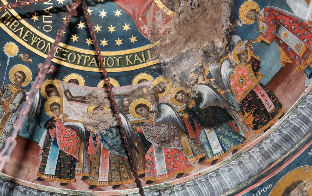 Φωτογραφία: Τμήμα της Ουράνιας Θείας Λειτουργίας στον τρούλλο της Ιεράς Μονής Παντοκράτορος, Άγιον Όρος. Εικονίζονται αρχάγγελοι-διάκονοι που μεταφέρουν σε πομπή τον επιτάφιο με τον νεκρό Χριστό, με επικεφαλής άγγελο που κρατά ριπίδιο και χερουβείμ να συμπληρώνουν τη σύνθεση.