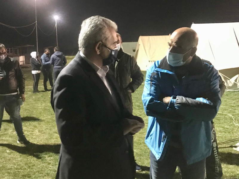 Αργά το σούρουπο, ο Μάξιμος Χαρακόπουλος επισκέφθηκε τα Πλατανούλια και με τον πρόεδρο του χωριού κ. Δημήτρη Ρίζο μετέβη στο γήπεδο, όπου έχουν εγκατασταθεί σεισμόπληκτες οικογένειες σε σκηνές. Συνομίλησε με τους σεισμόπληκτους κατοίκους που ζητούν μονιμότερες λύσεις με τροχόσπιτα και κοντέινερ, ενώ του έθεσαν και προβλήματα με την τηλεκπαίδευση των παιδιών τους στις σκηνές, λόγω της απουσίας σύνδεσης με το διαδίκτυο.
