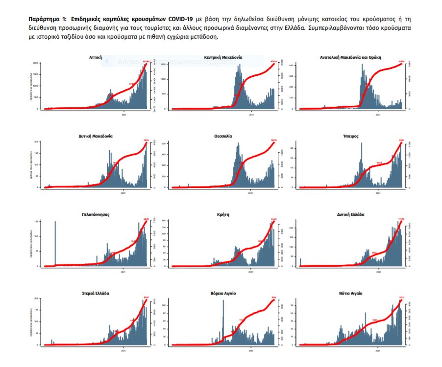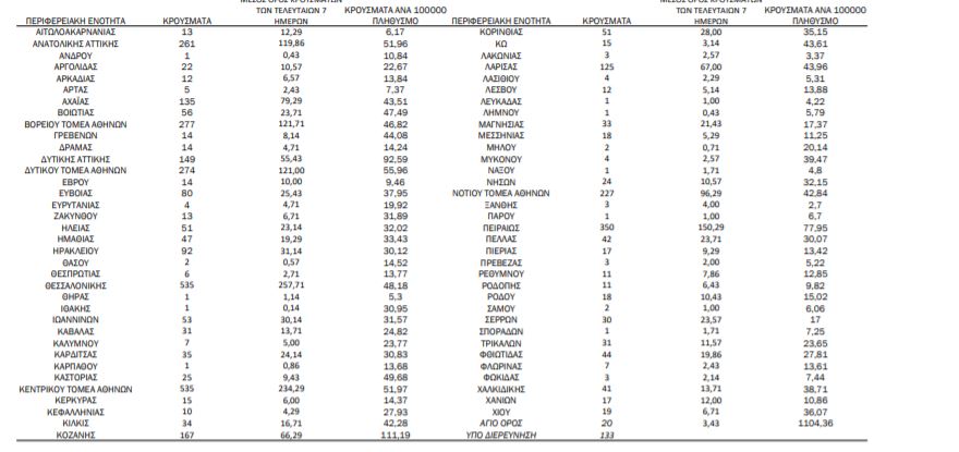 Με βάση τα επιβεβαιωμένα κρούσματα των τελευταίων 7 ημερών, 86 θεωρούνται σχετιζόμενα με ταξίδι από το εξωτερικό και 2.267 είναι σχετιζόμενα με ήδη γνωστό κρούσμα.