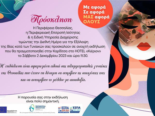 Με σύνθημα «ΜΕ αφορά, ΣΕ αφορά, ΜΑΣ αφορά ΟΛΟΥΣ», η Περιφερειακή Επιτροπή Ισότητας, η Περιφέρειας Θεσσαλίας και η Ειδική Υπηρεσίας Διαχείρισης του ΕΣΠΑ Θεσσαλίας διοργανώνουν αύριο Σάββατο 2 Δεκεμβρίου 2023 στις 11:30 π.μ. πανθεσσαλική εκδήλωση με αφορμή την παγκόσμια ημέρα κατά της έμφυλης βίας.