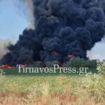 Ο καπνός φαίνεται από χιλιόμετρα μακριά. Στο σημείο σπεύδουν πυροσβεστικά οχήματα και η υδροφόρα του Δήμου Τυρνάβου για να συνδράμουν στην κατάσβεση.